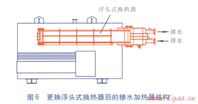 將原加熱盤管拆除(見圖4),更換成浮頭式換熱器(見圖5)。改造完畢后,按要求試壓。1臺摻水加熱爐安裝1臺浮頭式換熱器,另制造1臺浮頭式換熱器作為3臺摻水加熱爐的備用換熱器。當(dāng)某臺浮頭式換熱器結(jié)垢嚴(yán)重,需要清垢時,先停爐拆下該浮頭式換熱器,更換上備用換熱器,然后摻水加熱爐繼續(xù)運行,從而減輕對正常運行的影響。更換浮頭式換熱器后的摻水加熱器結(jié)構(gòu)見圖6。