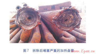 3臺摻水加熱爐于2012年10月陸續(xù)改造完成,并同期投產(chǎn)運行。改造后的3臺加熱爐運行情況基本平穩(wěn),直至2013年3月才陸續(xù)出現(xiàn)換熱效率低的現(xiàn)象。原加熱盤管基本兩個月就需要酸洗一次,酸液對金屬的腐蝕性強,易揮發(fā)產(chǎn)生酸霧污染原油,降低管道及設(shè)備的使用壽命[1]。而且隨著運行時間的延長,酸洗的次數(shù)增加,加熱盤管內(nèi)壁結(jié)垢傾向越來越嚴(yán)重,酸洗也變得無能為力。而改造后的浮頭換熱器能夠通過機械通洗繼續(xù)使用,清洗周期也比原加熱盤管有所延長。拆除后堵塞嚴(yán)重的加熱盤管見圖7,運行5個月的浮頭式換熱器換熱管端面見圖8。實踐充分證明,采用浮頭式換熱器替代蛇形加熱盤管,內(nèi)壁涂覆防垢涂層并提高摻水流速,有效地延緩了清洗時間。浮頭式換熱器可抽出,方便清洗,確保了原油正常生產(chǎn)。