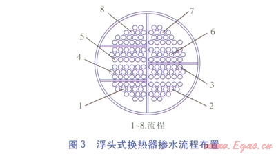 浮頭式換熱器摻水流程布置見圖3。流程1為進水,流程8為出水。摻水由流程1進入換熱器后,依次流經(jīng)流程2、3、4、5、6、7,最后由流程8流出。