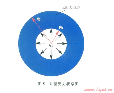 “地層 井眼”模型如圖5。地層可看作是半徑無(wú)窮大的圓,由圣維南原理[22]可知:無(wú)窮大地層半徑遠(yuǎn)大于井眼半徑,因此由井壁應(yīng)力對(duì)無(wú)窮遠(yuǎn)處的總應(yīng)力擾動(dòng)是很小的,可以不計(jì)。由于水泥漿未凝固,故井壁僅受水泥漿液柱壓力(qo)的內(nèi)壓作用。