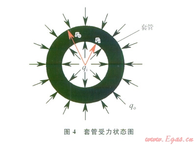 套管受力狀態(tài)見(jiàn)圖4,其中qi為候凝時(shí)由套管內(nèi)鉆井液或候凝液產(chǎn)生的均布載荷,qo為候凝時(shí)由環(huán)空水泥漿產(chǎn)生的液柱壓力。