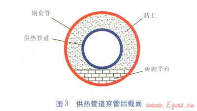供熱管道穿管前,在鋼套管底部用磚砌成419mm高的平臺(tái),平臺(tái)表面抹灰,保證平臺(tái)表面平整。在平臺(tái)上鋪一層1mm厚的鍍鋅鋼板,在供熱管道外護(hù)層外包覆一層0.5mm厚的鍍鋅鋼板保護(hù)供熱管道。穿管結(jié)束后,供熱管道與鋼套管之間通過泥漿泵填充黏土,以保護(hù)供熱管道。供熱管道穿管后截面見圖3。