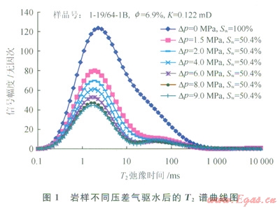 經(jīng)過成藏作用后,巖石孔隙中各類孔、喉中均有水的賦存,其賦存狀態(tài)受控于孔喉大小、形狀以及巖石表面物理性質(zhì)等[12],對(duì)于氣藏儲(chǔ)層來說,一般在細(xì)小孔喉處賦存的水較多。通過巖樣飽和水后進(jìn)行氣驅(qū)水和核磁共振實(shí)驗(yàn),分析了登婁庫(kù)組巖石中水的賦存特征。巖樣含水飽和度為100%時(shí)測(cè)試的核磁共振T2譜曲線反映的是孔隙內(nèi)全部水體積,曲線下包面積代表了巖樣的全部孔隙體積。在不同壓差氣驅(qū)水后(氣驅(qū)水過程的驅(qū)替壓差由小到大逐步增加),巖樣達(dá)到不同含水飽和度,隨著氣驅(qū)壓差的增大,巖樣含水飽和度降低,T2譜曲線下降(圖1),相鄰T2譜曲線之間的面積代表了兩條曲線對(duì)應(yīng)驅(qū)替壓力變化所引起的可動(dòng)流體變化量,因此由相鄰T2譜曲線之間的面積分布及大小可看出可動(dòng)水來自哪些孔隙及總量多少[13]。