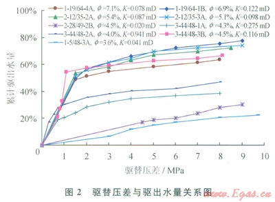 圖2是不同物性巖樣的實(shí)驗(yàn)結(jié)果,由于巖樣初始狀態(tài)為完全含水,含水飽和度在氣驅(qū)壓力起始點(diǎn)下降較大(累計(jì)驅(qū)出水量大),隨著氣驅(qū)壓力增加,含水飽和度下降幅度減小。不同壓差氣驅(qū)后含水飽和度下降幅度受孔隙度影響大,孔隙度大的巖樣含水飽和度最終下降幅度一般較大,而孔隙度相近的巖樣,滲透率小的飽和度最終下降幅度則小。
