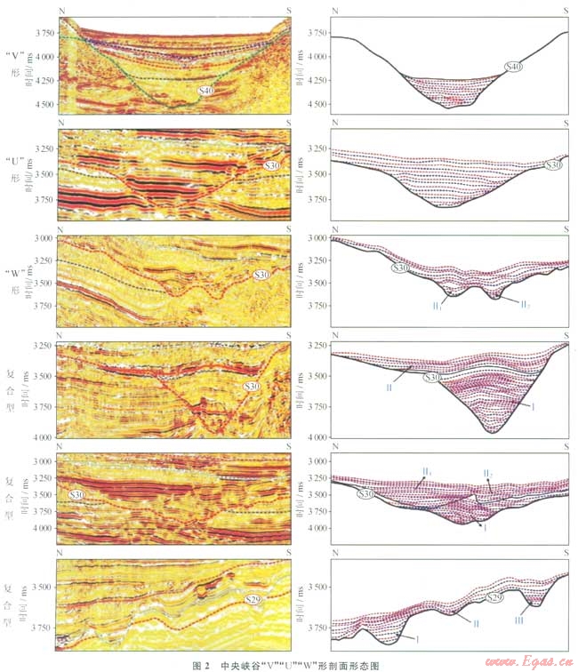瓊東南盆地經(jīng)歷了由陸到海的地質(zhì)演化過(guò)程,期間伴隨發(fā)育有多種類(lèi)型的儲(chǔ)集體:水道砂、低位扇、海底扇、生物礁、濱海砂壩、三角洲、古潛山等。其中以中新世黃流期發(fā)育于整個(gè)深水區(qū)中央坳陷帶內(nèi)的中央峽谷水道砂儲(chǔ)集體,特征最明顯。中央峽谷西起鶯歌海盆地東部陸坡,向東終止于南海西北次海盆,總長(zhǎng)度425km,寬度最大處為48.5km。其整體呈SW—NE走向,平面上呈“S”形展布,并具有“分段性”特征,由西至東可劃分為樂(lè)東段、陵水段、松南寶島段和長(zhǎng)昌段(圖1),剖面上呈對(duì)稱(chēng)或不對(duì)稱(chēng)的“V”“U”和“W”形態(tài)[6-7](圖2)。受多種地質(zhì)因素的共同控制,中央峽谷內(nèi)部充填結(jié)構(gòu)具有“多期次性”。充填了相互疊置的多套有利的砂泥巖儲(chǔ)蓋組合,并依靠峽谷邊界側(cè)封和巖性尖滅形成多個(gè)構(gòu)造+巖性圈閉,具有極大的勘探潛力。