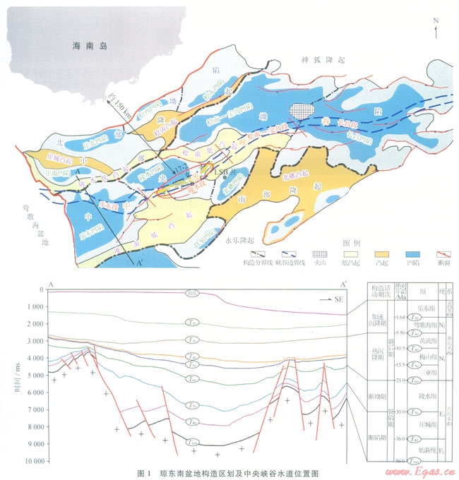 瓊東南盆地位于中國(guó)南海北部大陸邊緣,為新生代斷陷—坳陷盆地。具有準(zhǔn)被動(dòng)大陸邊緣盆地構(gòu)造特征,平面上則表現(xiàn)為南北分帶特征,由北至南可劃分為:北部坳陷、中部隆起、中央坳陷與南部隆起(圖1)。甕地經(jīng)歷由陸到海的演化過(guò)程,經(jīng)歷了斷陷期(T100—T70)、斷坳期(T70—T60)、熱沉降期(T60—T30)、加速沉降期(T30—現(xiàn)今)4個(gè)階段,整體可劃分為裂陷期(T100—T60)與裂后期(T60—現(xiàn)今)兩個(gè)時(shí)期,其絕對(duì)地質(zhì)年代如圖1所示,沉積了巨厚的新生代地層,厚度大于12000m[1-3]。