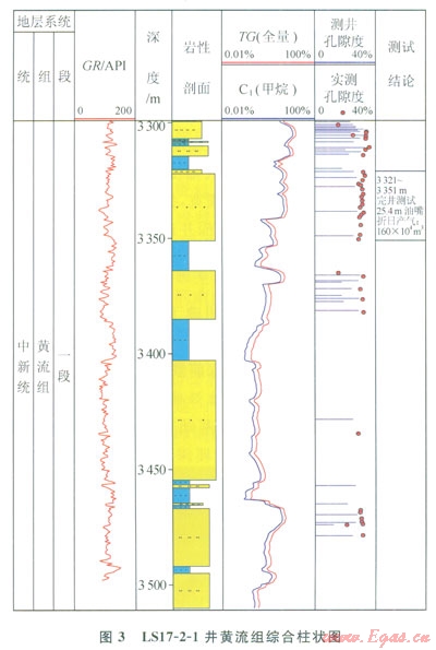 LS17-2-1井于2014年8月18日在新近系上中新統(tǒng)黃流組一段3321~3351m井段進(jìn)行試油,用25.4mm油嘴求產(chǎn),日產(chǎn)氣160×104m4、凝析油78m4,出于海上安全的考慮,沒(méi)有進(jìn)一步放大油嘴測(cè)試。測(cè)試結(jié)果表明,氣壓穩(wěn)定,地層能量充足。中海油于2014年9月15日對(duì)外公布了上述成果。