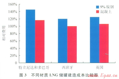 全混凝土罐的應用有很多優(yōu)點。首先,從材料角度講,國內的9%鎳鋼材市場緊張,且9%鎳鋼雖已初步實現(xiàn)國產化,但價格依然昂貴。與之相比,混凝土材料容易獲得,成本較低。其次,全混凝土罐的平行施工工序多,建造工期短(圖2),因工期產生的費用相對較低(圖3)。從圖2可以看出,全混凝土內罐與外罐的平行施工搭接時間長,保冷結構安裝與設備安裝可同時進;對于9%鎳鋼,外罐施工即將結束時才能進行內罐施工,保冷結構安裝與設備安裝不存在搭接時間。常規(guī)的16×104m3儲罐工期約為33個月,而全混凝土罐的建造工期約為25個月,可節(jié)省工期8個月。工期縮短可使LNG儲罐提前投產,也間接減小了LNG儲罐建造費用。從圖3可以看出,采用全混凝土LNG儲罐至少可節(jié)約20%的建造成本[3]。最后,全混凝土LNG罐可以擴大業(yè)主對承包商與設計單位的選擇范圍,優(yōu)化LNG儲罐的設計與建造市場。同時混凝土的應用在全球經驗都較為成熟,人們對混凝土低溫特性的認識也逐漸走向成熟[4]。