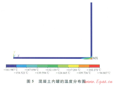 在正常運行條件下,LNG蒸發(fā)氣與LNG共存,LNG儲罐的環(huán)境溫度在-162℃附近,由ANSYS模擬可確定,對于0.8m厚的罐壁,穩(wěn)定后內罐外表面的溫度在-159℃附近。內罐整體被凍透,所以不考慮凍融的影響。內罐底板與罐壁的溫度分布如圖5所示。