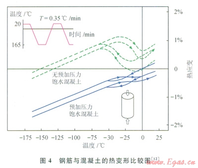在檢修、維護的情況下,混凝土內罐的局部溫度會有所升高,混凝土會受到凍融循環(huán)的影響。凍融循環(huán)試驗表明[8]:在凍融循環(huán)的情況下,鋼筋與混凝土的黏結強度、混凝土的強度隨凍融循環(huán)次數(shù)的增加而降低,且高含水量的混凝土受影響較大,減小混凝土中的含水量是降低凍融循環(huán)損害的有效途徑。圖4為鋼筋與混凝土的熱變形比較圖。從圖4以看出,在預加壓力下,混凝土與鋼筋的熱膨脹系數(shù)接近,且呈線性變化,所以對混凝土施加預應力,可有效提高鋼筋與混凝土的黏結性能,提高混凝土耐久性[12];快速有效的檢修、維護方案、管理制度也是降低凍融損害的有效辦法。