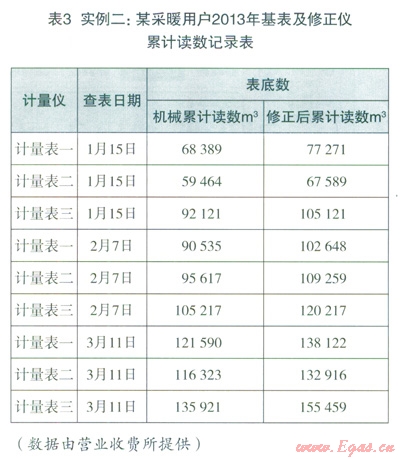 表3實(shí)例二采暖用戶2013年基表及修正儀累計(jì)湊數(shù)記錄表中,1月15日到3月ll日約2個(gè)月采暖區(qū)間(供暖期一般截止到3月15日),3臺(tái)計(jì)量表修正流量共計(jì)7651+8468+6538=22657m3,比不加體積修正儀流量體積多出14.7%按目前的采暖制冷價(jià)格2.67元/m3計(jì)算,此戶僅采暖季兩個(gè)月就增加氣費(fèi)收入60494元。