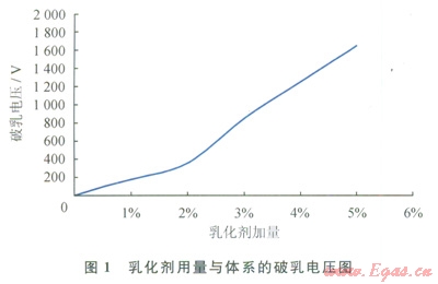 當(dāng)乳化劑加量大于3%時,體系的破乳電壓增加較快,加量為3%時,體系的破乳電壓達(dá)到850V,而當(dāng)乳化劑加量5%時體系的破乳電壓已經(jīng)達(dá)到1650V??紤]當(dāng)乳化劑加量為3%時,體系的破乳電壓已經(jīng)能夠滿足需要。因此選用乳化劑加量為3%。