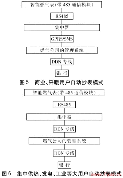特點:商業(yè)用戶主要包括酒店、餐廳等,常年用氣,用戶分散,流量通常在500m3/h以下。采暖、制冷用戶主要是季節(jié)性用氣大戶,而且在采暖、制冷期實行不同的燃氣價格機制,流量通常為500~5000m3/h。此類用戶的數(shù)量比居民用戶少得多,但用氣量卻遠大于居民用戶。建議采用圖5所示的自動抄表模式。