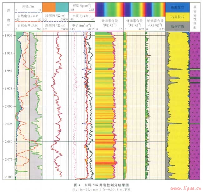 巖心資料、元素俘獲測(cè)井和常規(guī)曲線的結(jié)合給出了東坪氣田基巖儲(chǔ)層的巖性識(shí)別與劃分結(jié)果,表明北部的3區(qū)以花崗巖為主,夾有薄層的中基性侵入巖脈,侵入巖脈的厚度多在1~3m之間(圖4),與計(jì)算的孔隙度等參數(shù)對(duì)比,認(rèn)為侵入巖脈可作為儲(chǔ)層,且由于侵入主要是沿?cái)鄬拥冗M(jìn)行的,侵入過程誘導(dǎo)裂縫產(chǎn)生。因此巖脈的侵入對(duì)于儲(chǔ)層是一個(gè)積極的因素。南部的l區(qū)基巖以變質(zhì)巖為主,圖4是北部東坪306井的巖性劃分結(jié)果。位于區(qū)塊東北角的該井為鈣質(zhì)片麻巖,區(qū)塊內(nèi)已鉆的其他井多為花崗片麻巖和斜長(zhǎng)片麻巖,結(jié)合孔隙度、裂縫等參數(shù)分析認(rèn)為巖性對(duì)物性的控制作用不明顯,這3種不同類型的變質(zhì)巖都可以發(fā)育好的儲(chǔ)層。