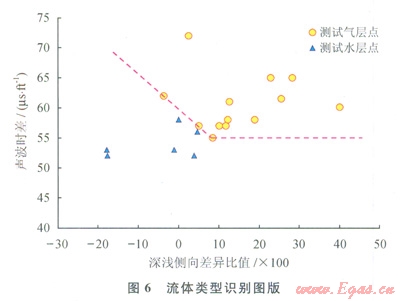 采用深、淺側(cè)向的差異同深電阻率的比值與聲波的交會(huì)圖來確定流體性質(zhì)(圖6)。從圖6中看出氣層點(diǎn)都位于右上方,而水層點(diǎn)位于左下方,從測(cè)井的原理上看含氣好的層段深淺側(cè)向有較大的正差異特征或者小的負(fù)差異,而水層由于淡水鉆井液的侵入會(huì)使得電阻率出現(xiàn)負(fù)差異,當(dāng)然裂縫的發(fā)育情況及產(chǎn)狀對(duì)電阻率的影響比較大,但從解釋結(jié)果看都是以網(wǎng)狀裂縫為主。因此認(rèn)為電阻率的差異與流體類型存在一定的聯(lián)系。