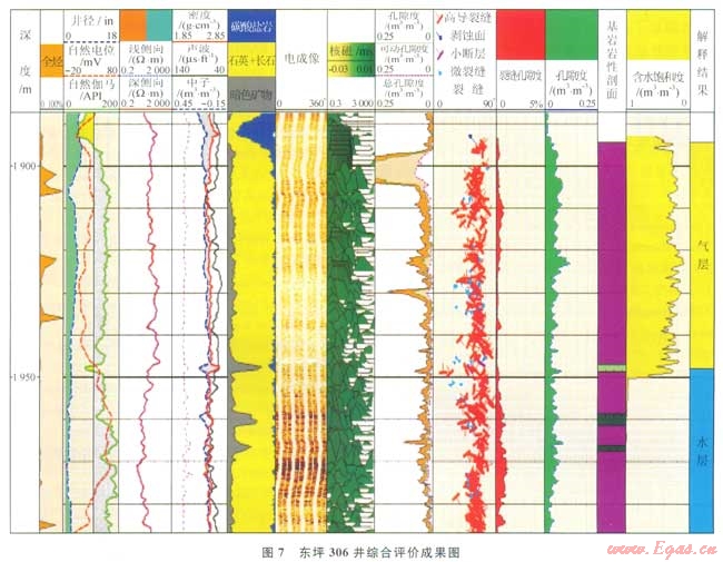 氣層與干層的確定是以孔隙度大大小進(jìn)行劃分的。核磁資料表明當(dāng)孔隙度為2%時(shí),可動(dòng)流體只有1%,同時(shí)參考了國內(nèi)外眾多的古潛山油氣藏,以孔隙度2%作為有效儲(chǔ)層的下限。據(jù)前述方法對(duì)區(qū)塊內(nèi)的井進(jìn)行了綜合評(píng)價(jià),如圖7所示為東坪306井的評(píng)價(jià)成果圖。該井1894.5m以下為花崗巖,電成像表明高導(dǎo)裂縫非常發(fā)育,裂縫孔隙度分布在0.05%~0.5%之間,總孔隙度為6.2%,計(jì)算的含氣飽和度為70%,深、淺側(cè)向有小的正差異氣測(cè)錄井顯示較好(中部因取心氣測(cè)低),解釋為氣層;下部巖性、物性與上部相當(dāng),但電阻率明顯降低,且深、淺側(cè)向基本重合,氣測(cè)無顯示,解釋為水層,據(jù)此確定了氣水界面。其數(shù)據(jù)為:井段1894.5~1950.0m,電阻率20~100W·m,核磁可動(dòng)孔隙度3.2%,溶蝕孔隙度6.2%,裂縫走向NWSE,裂縫孔隙度0.02%~0.50%,含氣飽和度70%,解釋為氣層;井段1950.0~2097.3m,電阻率4~80W·m,核磁可動(dòng)孔隙度1.5%,溶蝕孔隙度4.0%,裂縫走向NWSE,裂縫孔隙度0.05%~0.80%,含氣飽和度為0,解釋為水層。
