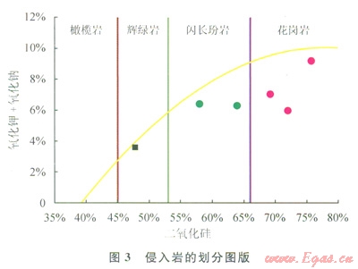 儲(chǔ)層巖性識(shí)別是油氣藏評(píng)價(jià)的前提和基礎(chǔ)工作,與常見的沉積巖不同的是基巖巖性復(fù)雜多變,測(cè)井識(shí)別困難。地面露頭踏勘和鉆井巖心分析表明東坪氣田的基巖包括火成巖和變質(zhì)巖兩大類巖性(圖1),北部3井區(qū)基巖以侵入巖為主,南部1井區(qū)以變質(zhì)巖為主。研究表明侵入巖主要為花崗巖,中間夾有輝綠巖、閃長(zhǎng)玢巖的巖脈。變質(zhì)巖可分為3大類,分別為花崗片麻巖、斜長(zhǎng)片麻巖和鈣質(zhì)片麻巖。侵入巖和變質(zhì)巖的區(qū)分可利用鉀和自然伽馬的交會(huì)圖(圖2)。由于侵入巖以鉀長(zhǎng)石含量較高的花崗巖為主,其鉀含量和自然伽馬為相對(duì)高值,變質(zhì)巖的鉀和自然伽馬相對(duì)低值。因此侵入巖位于交會(huì)圖的右上角而變質(zhì)巖位于交會(huì)圖的左下方。利用元素俘獲譜資料實(shí)現(xiàn)兩大類巖性的細(xì)分。二氧化硅與氧化鈉和氧化鉀之和的交會(huì)圖(圖3)實(shí)現(xiàn)侵入巖的細(xì)分,花崗巖的二氧化硅含量高,為66%,輝綠巖為45%~53%,閃長(zhǎng)玢巖為53%~66%。據(jù)此實(shí)現(xiàn)了北部3井區(qū)基巖儲(chǔ)層巖性的識(shí)別與劃分。變質(zhì)巖的種類繁多且其成因復(fù)雜,因而變質(zhì)巖的識(shí)別與劃分相對(duì)侵入巖要復(fù)雜得多。通常認(rèn)為在變質(zhì)巖的形成過程中化學(xué)成分穩(wěn)定,這為利用元素俘獲譜測(cè)井劃分巖性提供了有利條件,同時(shí)由于礦物成分的不同其密度與中子值也有所不同。因此常規(guī)曲線對(duì)巖性的劃分也提供了好的資料。