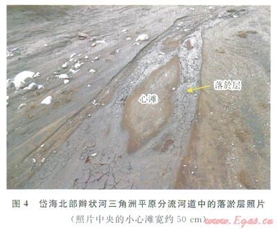 辮狀分流河道較直,以礫石質(zhì)沉積為主,向下游方向逐漸變細,砂質(zhì)增多,到達湖岸線附近時以細礫和中、粗砂為主,寬2~15m,深幾十厘米到1m左右。其內(nèi)可進一步劃分為心灘和水道兩個亞微相。