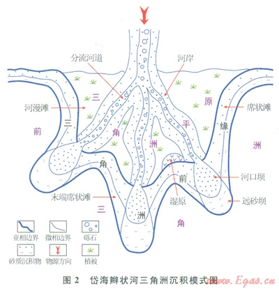 2)辮狀河入湖可以形成兩種三角洲,即分流河道呈辮狀河的三角洲和分流河道呈曲流河的三角洲,前者發(fā)育于三角洲形成早期階段,三角洲平原較小、坡度較大;后者發(fā)育于三角洲形成晚期階段,三角洲平原變大、變平緩,皆呈朵狀。