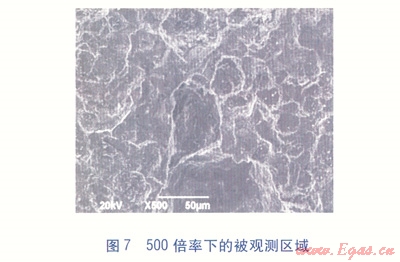 掃描電鏡為JSM—6490LV型掃描電子顯微鏡,采用20kV加速電壓,在真空條件下對壓力實驗336h后且進(jìn)行交流阻抗實驗后的涂層進(jìn)行掃描,在放大倍率為200、500的情況下觀察涂層的表面形貌(分別見圖6、7)。由圖6、7可知,被觀測區(qū)域有一個腐蝕形成的不規(guī)則凹坑(顏色較深部分),但腐蝕并不嚴(yán)重。