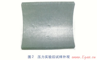 壓力實驗后試樣外觀見圖2。比較圖1、2可知,壓力實驗前后涂層顏色未出現(xiàn)明顯變化,涂層表面光滑平整,無起泡、針孔、裂紋等現(xiàn)象,也未腫脹及變軟。涂層與基材之間未脫落,附著情況良好。