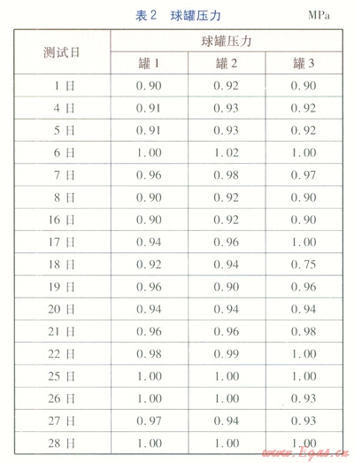 儲氣溫度與壓力是影響球罐內(nèi)鼙腐蝕的環(huán)境因素[2]。球罐儲氣溫度為-10~60℃。2013年2月各測試日3臺球罐的壓力(10:00的數(shù)據(jù))見表2。由表2可知,罐l~3壓力范圍分別為0.90~1.00、0.90~1.02、0.75~1.00MPa。通常,設(shè)計壓力為運行壓力的l.2倍,因此在壓力實驗時選取1.2 MPa作為實驗壓力。各項實驗中選取的基材材質(zhì)與球罐罐體內(nèi)壁材質(zhì)一致,涂層平均厚度為175mm。