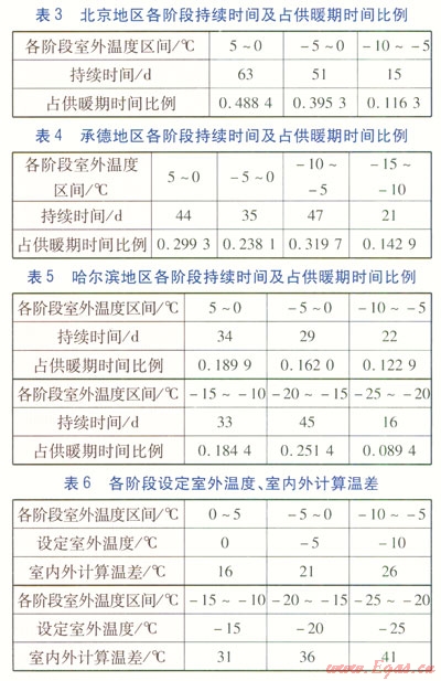 下面以北京、承德、哈爾濱地區(qū)為例,分析分布式循環(huán)泵供熱系統(tǒng)節(jié)能率的影響因素。北京、承德、哈爾濱地區(qū)各階段持續(xù)時間及占供暖期時間比例分別見表3~5。各階段設(shè)定室外溫度、室內(nèi)外計(jì)算溫差見表6。根據(jù)表3~6數(shù)據(jù),并依據(jù)相關(guān)規(guī)范設(shè)定3個地區(qū)建筑物圍護(hù)結(jié)構(gòu)熱工參數(shù)。經(jīng)計(jì)算呵得到,北京、承德、哈爾濱地區(qū)采用分布式循環(huán)泵供熱系統(tǒng)的節(jié)能率分別為20.0%、19.7%、18.5%。