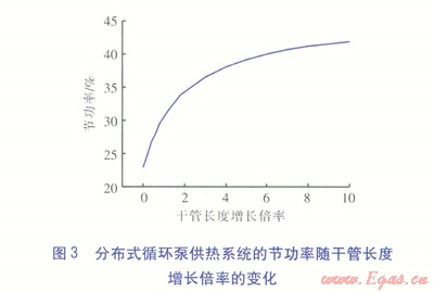 在設(shè)定室外溫度為-8℃的情況下,分布式循環(huán)泵供熱系統(tǒng)的節(jié)功率隨干管長度增長倍率(各段干管長度同步增長)的變化見圖3。由圖3可知,隨著干管長度增長倍率的增大,分布式循環(huán)泵供熱系統(tǒng)的節(jié)功率隨之增大。