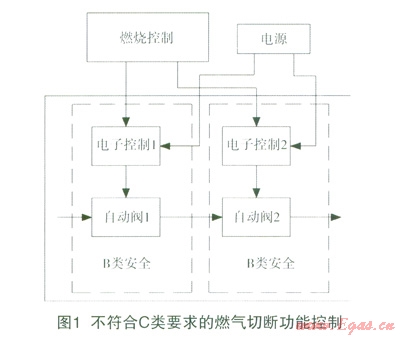 第一,兩個閥門的控制均符合B類安全要求,但組合是不能達到C安全要求的,如圖1。從閥門組合的容錯上分析,當其中一個閥門失控(如有雜物或卡死),另一個閥能保持正常即可符合安全要求。例如,自動閥2失控,自動閥1必須保證安全。B類安全的要求是電子控制1在第一個故障的條件下保證安全狀態(tài),但該故障可能不被檢測到,當?shù)诙€故障仍出現(xiàn)在電子控制1時,電子控制1可能導(dǎo)致自動閥1不受控,這樣兩個閥都不受控,所以不符合C類安全要求。