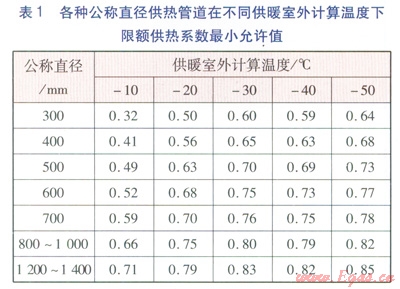 由于目前我國沒有限額供熱系統(tǒng)的具體規(guī)定值,因此參考CHnH 41—02—2003確定。各種公稱直徑供熱管道在不同供暖室外計(jì)算溫度下限額供熱系數(shù)最小允許值見表1。