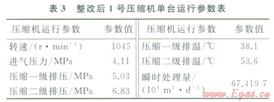數(shù)據(jù)分析得出:①由圖5知,工藝管線整改后,1號壓縮機(jī)單臺運(yùn)行時管線的振動位移和速度大大降低,最大位移為47.2mm,最大振動速度為5.18mm/s,遠(yuǎn)低于限定值;②相比1號壓縮機(jī)單臺運(yùn)行而言,1號、2號壓縮機(jī)同時運(yùn)行時工藝管線的振動略微增加,最大位移為65.87mm,最大速度為6.55mm/s,但都在標(biāo)準(zhǔn)范圍之內(nèi);③1號壓縮機(jī)單臺運(yùn)行時,測點(diǎn)B處的波峰壓力為4.128MPa,波谷壓力為4.115MPa,壓力不均勻度為0.3%,低于壓力脈動限制值0.54%(API 618);④由于1號、2號兩臺壓縮機(jī)同時運(yùn)行時,處理量達(dá)到了119.52×104m3/d,增壓站的處理能力得到較大提升;⑤另外,3號、4號壓縮機(jī)共用另一匯氣管,工藝管線振動情況與1號、2號壓縮機(jī)運(yùn)行時基本一致,管線振動也滿足標(biāo)準(zhǔn)要求。