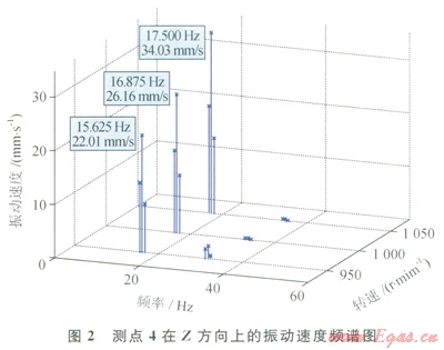 導(dǎo)致管線振動因素很多,主要有管線系統(tǒng)結(jié)構(gòu)的固有頻率落在共振區(qū)引發(fā)的機(jī)械共振,管流的氣柱同有頻率落在共振區(qū)引發(fā)的氣柱共振,壓力脈動過大引起的管道振動,以及動力平衡性差引起的振動[7]。為了全面分析工藝管線振動的原因,根據(jù)機(jī)組的實(shí)際情況,采用便攜式振動測試儀對管線的關(guān)鍵部位進(jìn)行了現(xiàn)場測試。振動測點(diǎn)1~5的位置及方向、壓力脈動測點(diǎn)A的位置見圖1。測試工況為:①1號壓縮機(jī)在3種不同轉(zhuǎn)速下單臺運(yùn)行;②1號壓縮機(jī)轉(zhuǎn)速為1050r/min,窄載和負(fù)載運(yùn)行;③測點(diǎn)A處的壓力脈動測試。測試結(jié)果包括測點(diǎn)的振動位移、振動速度、壓力脈動以及測點(diǎn)振動速度的頻譜特性。鑒于測試數(shù)據(jù)較多,只列出了具有代表性的測試結(jié)果,其中1號壓縮機(jī)運(yùn)行參數(shù)和測點(diǎn)的振動值分別見表1、2,測點(diǎn)4在Z方向的振動速度頻譜見圖2。結(jié)合國內(nèi)外機(jī)械振動測量與評價的相關(guān)標(biāo)準(zhǔn),確定管線振動烈度級為18,振動位移界限值為283mm,振動速度界限值為17.8mm/s[8-9]。