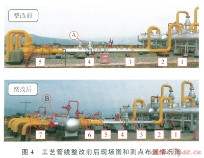1)分析不同工況下管線的振動速度頻譜特性以及關(guān)鍵點(diǎn)的壓力脈動測試,得出了壓力脈動是引起管線振動的主要原因,其根源在于匯氣管緩沖容積太小,進(jìn)出口配置不合理,產(chǎn)生了較大的激振力,使管線受迫振動。為了控制管道的壓力脈動,提出了增大匯氣管的緩沖容積、增加彎頭曲率半徑以及合理布置支承的治理措施。工藝管線整改完成后,測點(diǎn)的振動明顯降低,壓力脈動達(dá)到了要求,取得了較好的減振效果,同時也提升了增壓站的處理能力。