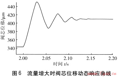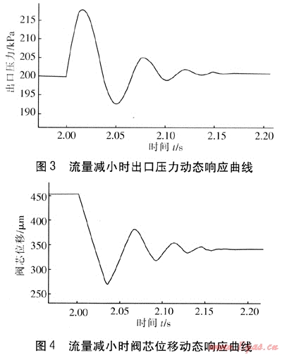 調(diào)壓器在穩(wěn)定狀態(tài)運(yùn)行2.00s時突然增大閥門開度,流量突然增大,出口壓力和閥芯位移動態(tài)響應(yīng)曲線見圖5、6。