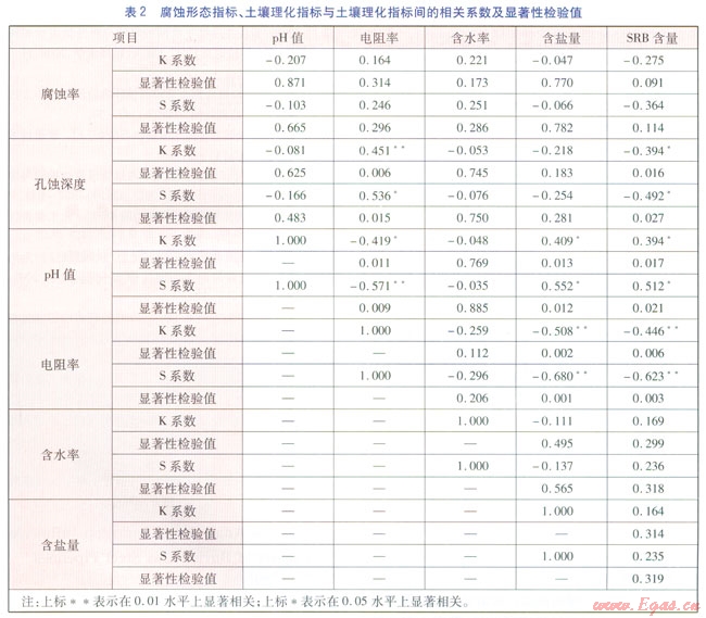 依據(jù)表1中20組樣本數(shù)據(jù),計算得出腐蝕形態(tài)指標(biāo)與土壤理化指標(biāo)間的相關(guān)系數(shù),所得相關(guān)系數(shù)絕對值越大,相關(guān)性越強(qiáng),當(dāng)求得的相關(guān)系數(shù)絕對值大于相關(guān)系數(shù)雙側(cè)檢驗臨界值時,變量間顯著相關(guān)(相關(guān)系數(shù)為正,變量顯著正相關(guān);相關(guān)系數(shù)為負(fù),變量顯著負(fù)相關(guān)),否則不相關(guān)。