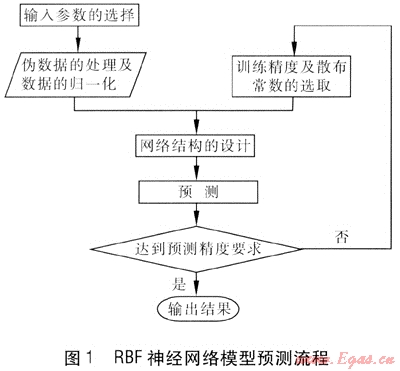 RBF網(wǎng)絡(luò)和普通的前向網(wǎng)絡(luò)有所不同,隱層神經(jīng)元是徑向基神經(jīng)元而不是tansig或者logsig神經(jīng)元。普通前向網(wǎng)絡(luò)中sigmoid神經(jīng)元能夠覆蓋較大的輸入?yún)^(qū)域,但是普通前向神經(jīng)元數(shù)目在訓(xùn)練前就已經(jīng)固定下來。而徑向基神經(jīng)元雖然只對相對較小的區(qū)域產(chǎn)生響應(yīng),但是在輸入?yún)^(qū)間較大時(shí),可以適當(dāng)?shù)卦黾訌较蚧窠?jīng)元來調(diào)整網(wǎng)絡(luò),從而達(dá)到精度要求。且RBF網(wǎng)絡(luò)的設(shè)計(jì)比普通前向網(wǎng)絡(luò)訓(xùn)練要省時(shí)得多[6]。RBF網(wǎng)絡(luò)模型預(yù)測流程見圖1。