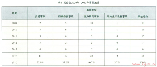 搞好安全管理的前提是進(jìn)行風(fēng)險(xiǎn)分析。根據(jù)企業(yè)的具體特點(diǎn),對全企業(yè)進(jìn)行全面而系統(tǒng)的安全風(fēng)險(xiǎn)分析,按照現(xiàn)代系統(tǒng)安全工程的觀點(diǎn),安全生產(chǎn)工作是為了使生產(chǎn)過程符合物質(zhì)條件和工作秩序,防止發(fā)生人身傷亡和財(cái)產(chǎn)損失的活動,安全牛產(chǎn)工作的主要目標(biāo)是使系統(tǒng)中的人員免遭不可承受風(fēng)險(xiǎn)的傷害。安全管理工作實(shí)際上就是風(fēng)險(xiǎn)管理工作。各崗位的危險(xiǎn)程度用危險(xiǎn)度來表示,它是由事故發(fā)生的可能性和事故后果的嚴(yán)重性決定的。經(jīng)過對國有瓶裝氣企業(yè)進(jìn)行安全風(fēng)險(xiǎn)陛分析,我們得出最常見的安全風(fēng)險(xiǎn)主要有交通安全風(fēng)險(xiǎn)、鋼瓶傷害風(fēng)險(xiǎn)、場站安全風(fēng)險(xiǎn)、客戶用氣事故風(fēng)險(xiǎn)等等,這與國有瓶裝氣企業(yè)歷年安全事故統(tǒng)計(jì)相吻合,某企業(yè)2009年~2013年事故統(tǒng)計(jì)見表1。