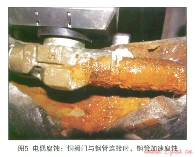 在金屬活動順序表中,Fe要比Cu活潑,在相同的環(huán)境中,Fe的電位要比Cu負。當(dāng)異種金屬相接觸,處于相互連通的電解質(zhì)中時,由于不同金屬之間存在實際電位差而使電位較低的金屬腐蝕速度比原來增大,電位較高的金屬的腐蝕速度減小,這種現(xiàn)象稱為電偶腐蝕[4],見圖5所示。當(dāng)鋼與銅相互接觸時,鋼的腐蝕速率比其單獨存在時加大。在閥門位置,利用銅包鋼或者銅網(wǎng)進行接地時,由于電偶腐蝕的作用,會加速閥門的腐蝕。同時由于銅的良好導(dǎo)電性和自腐蝕較低的特性,利用銅材質(zhì)進行接地時,接觸電阻要比閥門直接接地更低,在這種情況下,陰極保護電流集中流入流出的現(xiàn)象會更加嚴重。