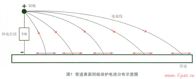 陰極保護系統(tǒng)電路路徑的構(gòu)成包括:土壤、管道、導(dǎo)線[2]。對于直流電路來說,根據(jù)歐姆定律可以知道,電路中的電流在流動過程中,電流會始終傾向于在電阻較小的路徑流動。當(dāng)管道的防腐層面電阻率變化不大、防腐層沒有出現(xiàn)嚴重的破損點和接地的情況時,管道表面陰極保護電流的分布是相對較為均勻的,如圖1所示。