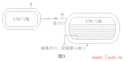 (2)LNG內(nèi)膽主安全閥開(kāi)啟壓力為1.59MPa(230psi),為了安全起見(jiàn)(調(diào)壓器會(huì)出現(xiàn)失效)CNG儲(chǔ)罐充裝壓力不能超過(guò)l.59MPa。把CNG與LNG瓶按圖3連接好后都要接上地線。