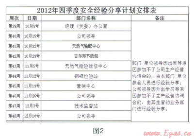 安全經(jīng)驗分享活動的持續(xù)開展,內(nèi)容的通俗、分享的形式引起員工的共鳴,活動得到了大家的認(rèn)可,同時表達(dá)出分享的愿望。因此,公司安全部門制定《XX季度安全經(jīng)驗分享計劃安排表》,按照分享計劃,以每周生產(chǎn)協(xié)調(diào)例會為平臺,公司領(lǐng)導(dǎo)、各部門、單位收集業(yè)務(wù)范圍內(nèi)的HSE素材,主動開展安全經(jīng)驗分享。(見圖2)