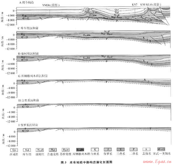 庫(kù)車坳陷構(gòu)造變形主要發(fā)生在新近系以后,康村組沉積后構(gòu)造活動(dòng)開始活躍,庫(kù)車組中期構(gòu)造活動(dòng)最為強(qiáng)烈,持續(xù)至現(xiàn)今仍在活動(dòng)。古近系沉積前,中生界地層受古隆起構(gòu)造控制,呈現(xiàn)南薄北厚的楔形體,晚白堊世發(fā)生區(qū)域隆升作用,并沒有發(fā)育明顯的斷裂。古近系-新近系康村組沉積前主要是坳陷發(fā)育階段,構(gòu)造活動(dòng)較弱。從圈閉形成與改造角度考慮,庫(kù)車坳陷構(gòu)造演化可劃分為以下3個(gè)主要階段(圖3):