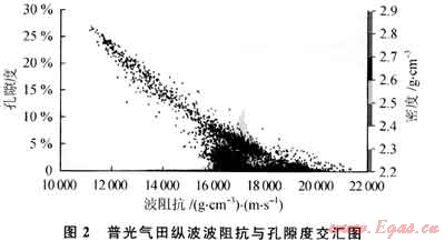 地震資料的優(yōu)勢在于能夠提供遠離井點的儲集層信息.但該數(shù)據(jù)體是否能用于約束儲集層參數(shù)建模,還需要進一步分析其與儲集層物性參數(shù)的相關(guān)性,只有兩者相關(guān)性好,方可用地震資料反演約束建模。選擇何種地震屬性作為約束條件,以及利用地震數(shù)據(jù)體對何種儲層參數(shù)做約束是這種建模方法中很重要的一個環(huán)節(jié)。通過分析認為,孔隙度曲線與地震反演波阻抗之間存在良好的負相關(guān)(圖2),即高孔隙度層段通常都對應于低波阻抗反射波,而低孔隙度層對應于高波阻抗。