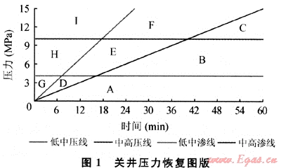 “評(píng)價(jià)點(diǎn)”的壓力值代表井底欠平衡程度,亦代表最大關(guān)井井口壓力,因此需要用幾條壓力值線來區(qū)分壓力級(jí)別[8]。從起始恢復(fù)點(diǎn)到該評(píng)價(jià)點(diǎn)的連線的斜率表示關(guān)井壓力恢復(fù)的快慢,取決于地層氣體侵入井筒能力的大小,代表著地層系數(shù)的大小。因此需要用始于起始恢復(fù)點(diǎn)的幾條不同斜率的直線來區(qū)分地層系數(shù)級(jí)別。這樣,關(guān)井壓力恢復(fù)圖版應(yīng)包括幾條壓力級(jí)別水平線和幾條地層系數(shù)級(jí)別斜線。圖1中關(guān)井壓力恢復(fù)圖版中的低中壓界限和中高壓界限為兩條水平線(壓力值分別為4MPa和10MPa),用以界定關(guān)井壓力恢復(fù)評(píng)價(jià)點(diǎn)的幅值,低中地層系數(shù)界限和中高地層系數(shù)界限為兩條斜線(斜率分別為25°、50°),用以界定關(guān)井壓力恢復(fù)的斜率,即關(guān)井壓力恢復(fù)的快慢。