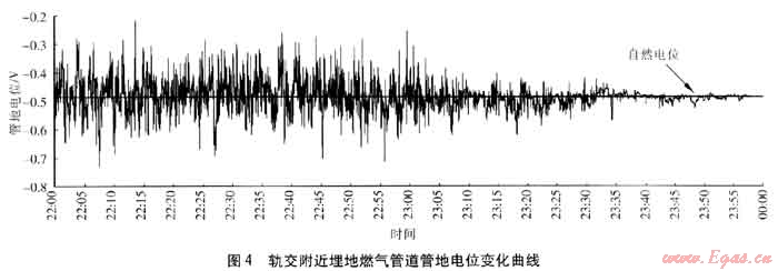 以管道未受干擾時的自然電位為基準(zhǔn),雜散電流流入?yún)^(qū),管地電位負(fù)向偏移,管道處于陰極區(qū)受到保護(hù);雜散電流流出區(qū),管地電位正向偏移,管道為陽極區(qū)發(fā)生腐蝕,必須采取防護(hù)措施。對于動態(tài)雜散電流干擾,管道陰極區(qū)和陽極區(qū)分布是動態(tài)變化的,管道某點可能處于雜散電流流入、流出交替變化中,為管道雜散電流腐蝕判定及防護(hù)帶來一定的困難。對上海市某軌道交通旁的埋地燃?xì)夤艿拦艿仉娢贿M(jìn)行實時監(jiān)測,變化如圖4,測試過程中將犧牲陽極斷開,以軌交停運后管地電位平均值作為自然電位。在軌交運行期間多列機(jī)車通過測試點,管地電位相對自然電位正負(fù)交替變化,電位正向和負(fù)向偏移均比較明顯。