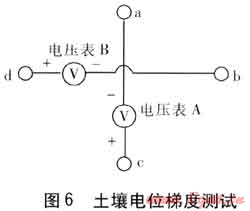 土壤電位梯度指土壤中電流流動形成的電位差,可通過沿管道方向和垂直管道方向兩組參比電極電位差矢量和求得,測試接線見圖6。4只銅/飽和硫酸銅(Cu/CuS04)參比電極a、b、c、d;ac與bd垂直對稱布置且距離相等,其中ac與管道平行且電極間距宜為100m,當(dāng)受到環(huán)境限制時可適當(dāng)縮短。電壓表所測得的Vac和Vbd除以電極間距,則得到與管道平行和與管道垂直方向的土壤電位梯度,其矢量和即為該點的土壤電位梯度。土壤電位梯度的大小可判定雜散電流大小,電位梯度方向與雜散電流方向相同。
