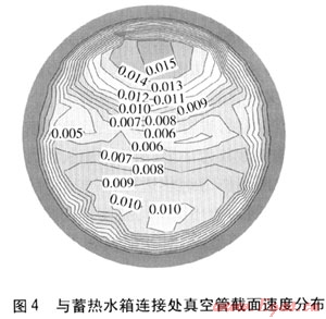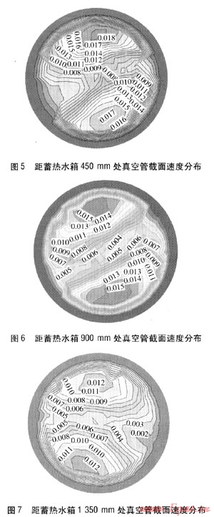 真空管(長度為1800mm)與蓄熱水箱連接處以及距蓄熱水箱450、900、1350mm處的真空管截面速度分布分別見圖4~7,圖中數(shù)值單位均為m/s。由圖4~7可知,沿著遠離蓄熱水箱方向,真空管內(nèi)冷熱流體的速度先增大后減小,在距蓄熱水箱450mm處速度最大。說明在距蓄熱水箱450mm這段真空管內(nèi)存在冷熱流體的回流混合,造成熱損失,降低了集熱系統(tǒng)的效率,采用引流擋板可以在一定程度上解決該問題[11]。