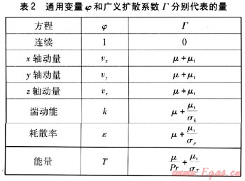 在各個控制方程中,通用變量φ和廣義擴散系數(shù)Γ分別代表的量見表2。
