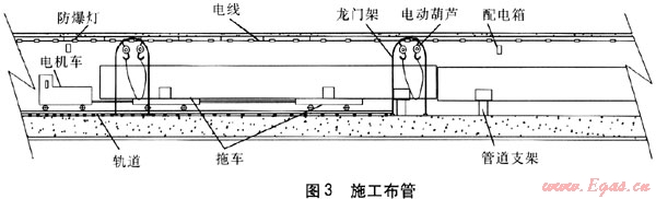 吊裝下井的鋼管直接放置在拖車上,為防止鋼管防腐層損壞,拖車上敷設(shè)橡膠板。拖車靠電機(jī)車的推力進(jìn)行鋼管運輸,電機(jī)車車頭在后,鋼管在前。鋼管運輸過程中,所有施工人員不得停留在鋼管前方。電機(jī)車每次運管1根,鋼管與拖車之間用手動葫蘆牢固固定(并加裝鋼絲繩,作為保險鏈),防止電機(jī)車下坡時鋼管向前滑動。鋼管兩側(cè)放置斜形木方(木方上面墊有橡膠板)并用手動葫蘆拉緊,防止鋼管向兩側(cè)滾動。鋼管運輸至軌道盡頭時,通過2個龍門架吊起,電機(jī)車退出,軌道拆除,利用龍門架上的電動葫蘆將鋼管放置在臨時馬鐙上。布置若干根管后安裝管道支架(預(yù)先在管道支架下方縱向放置兩根直鋼筋,為調(diào)整管道的橫向位移作好準(zhǔn)備)。用龍門架將鋼管放置到支架上,使鋼管與隧道壁的距離大于350mm,能夠滿足焊接要求[3]。隨著左側(cè)管道的敷設(shè),陸續(xù)拆除軌道,并將拆除掉的軌道依次橫放于未焊接管道一側(cè),為焊接留出足夠的安全作業(yè)空間。布管時要注意測量預(yù)留管道長度,保證焊口位置不能在支架下方,以免影響后續(xù)焊接作業(yè)。布管300m后開始進(jìn)行焊接施工,同時布管工作繼續(xù)進(jìn)行,實行交叉流水作業(yè)。施工布管見圖3。