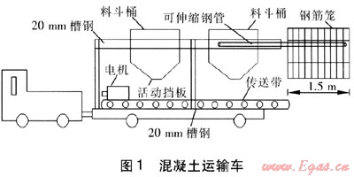 根據(jù)隧道的內(nèi)徑大小,現(xiàn)場制作混凝土運輸車,見圖1。受電機(jī)車的運載能力和空間限制,運輸車一次可運輸4m3的混凝土,可澆筑墊層長度為3m;可同時運輸鋼筋籠、預(yù)埋件和混凝土,在運輸鋼筋籠時伸長可伸縮鋼管,將鋼筋籠掛在上面,鋼筋籠的長度為1.5m,將預(yù)埋件固定在裝滿混凝土的料斗桶內(nèi)?;炷恋拇怪边\輸采用起重量為100kN的龍門吊,吊筒采用漏斗型開閉式,容積為1.5~2.0m3。混凝土在隧道內(nèi)的水平運輸采用牽引力為150kN的軌道電機(jī)車牽引一臺混凝土運輸車。